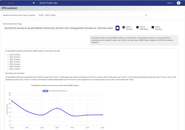 - “Wat is de gemiddelde snelheid op locatie ABC005 over de afgelopen jaren?”